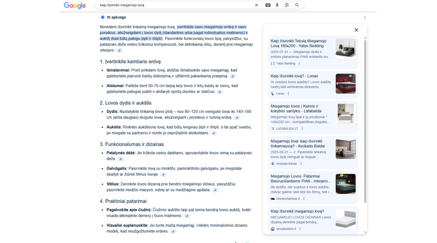 Raktažodis „kaip išsirinkti miegamojo lovą“ pateko į Google AI Overview (featured snippet), kas užtikrino turinio matomumą paieškos viršuje.