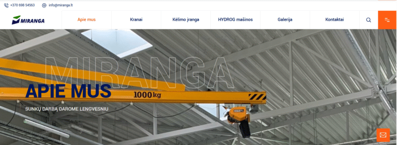 Miranga tinklalapis sukurtas modernus ir patogus su aiškia struktūra, įdiegtos pagrindinės funkcijos – paslaugų ir produktų katalogai, kontaktų forma bei PDF dokumentų peržiūros įrankis, leidžiantis patogiai skaityti techninius dokumentus ar katalogus tiesiog svetainėje.